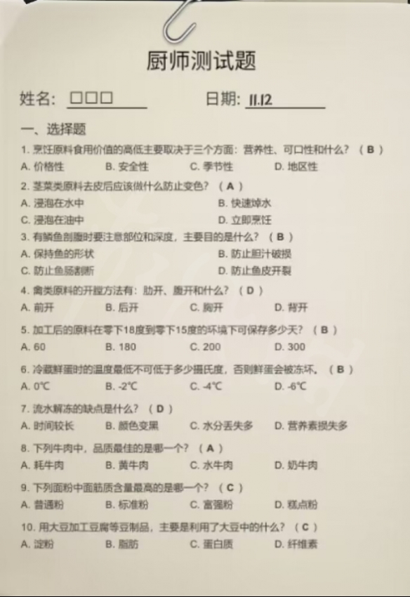 以上就是大多數遊戲廚師考核答案的內容了,更多遊戲相關資訊攻略請關注,我們將會第一時間更新最全的內容幫助大家了解該遊戲,一起來看一下吧。
