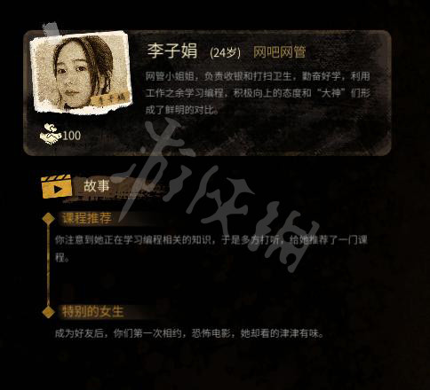 李子娟是游戲中的網吧網管,負責收銀和打掃衛生。