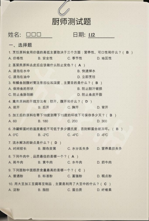 1.烹飪原材料食用價值的高低主要取決於三個方面:營養性、可口性、和什麼?(安全性)B