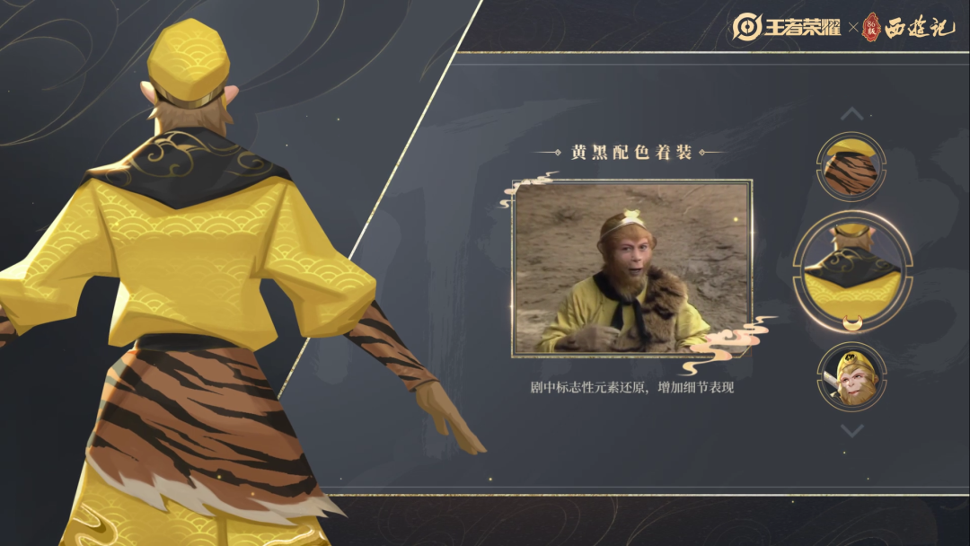作為《西遊記》中最重要的角色,王者榮耀選取了孫悟空做經典還原。在視覺表現上,以劇中的經典造型和橋段作為核心。為了更好地體現86版《西遊記》中孫悟空的靈動王者榮耀在展示待機、局內待機、技能動畫、行走動作等都往西遊記的方向進行了動畫調整,並以86版《西遊記》中經典故事橋段為原點,展現孫悟空神通廣大、勇敢無畏,致敬經典橋段。