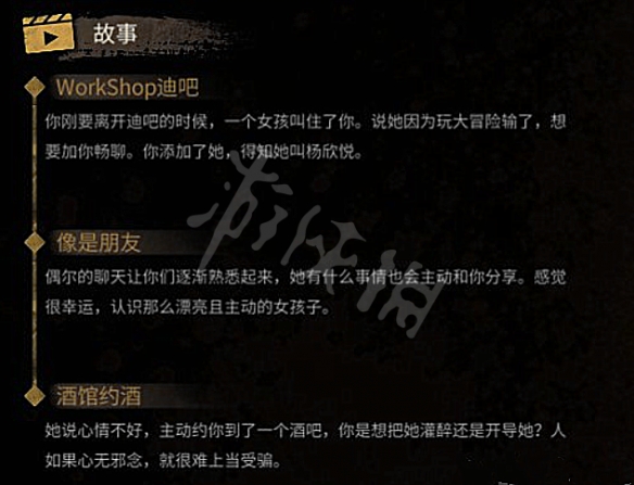 WorkShop迪吧你剛要離開迪吧的時候,一個女孩叫住了你。說她因為玩大冒險輸了,想要加你暢聊。你添加了她,得知她叫楊欣悅像是朋友。