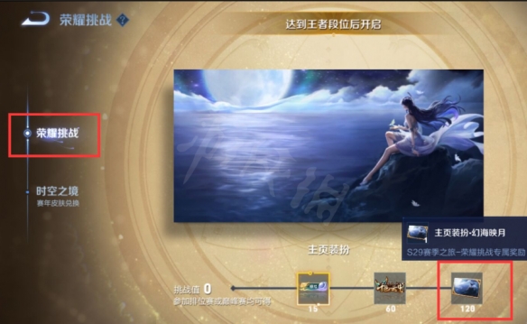 1、進入排位頁面選擇榮耀挑戰,積累120的挑戰值即可獲得海月的幻海映月主頁裝扮。