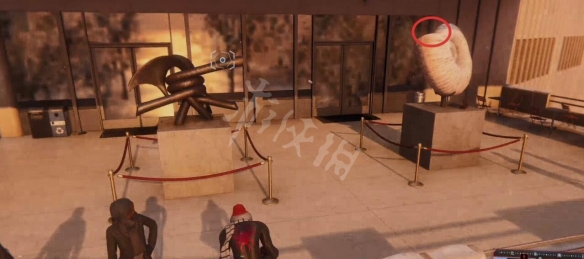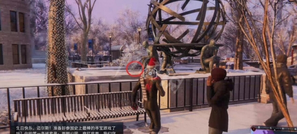 2、到自然歷史博物館,在紫色區域內,背著球的雕像前,找到下一條線索。