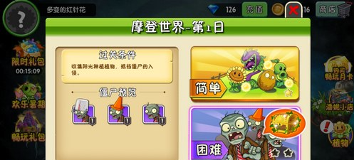 摩登世界第1日過關條件:收集陽光種植植物,抵擋殭屍的入侵