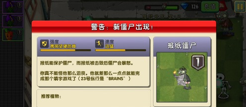 值得一提的是遊戲中出現了新殭屍,那就是報紙殭屍。報紙能夠保護殭屍,而報紙被擊毀後殭屍會暴怒,玩家們可要小心咯。