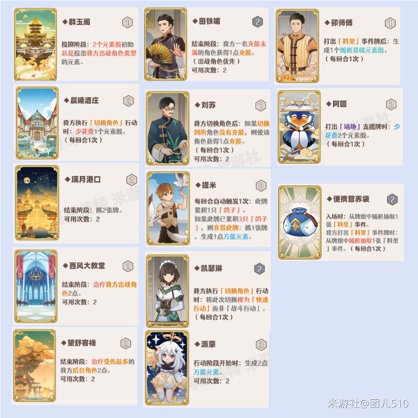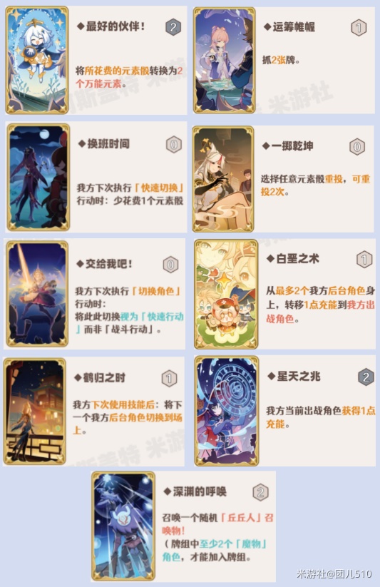召喚流-後發制人(配卡篇)整體思路:提高手牌的循環,保證角色的生存和充能。對聖遺物和武器牌的依賴極低,非必要情況可不裝備。(重要程度:事件牌>支援牌>裝備牌)