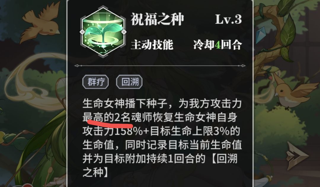 2、生命之女的技能回復增益主要局限於攻擊力最高的兩名魂師,無論是護盾還是生命回復,以及各種增益效果,有點顧頭不顧腳,使全隊的恢復不均衡,因此生命之女單掛隊伍會導致除輸出以外的魂師容易掉點。