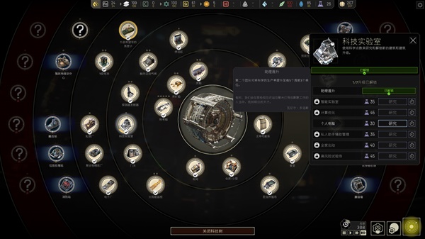遊戲從第二章開始就非常的惡心人,躍遷一次減100血量上限,並且掉血速度翻倍,每開一個區域,掉血速度翻倍,第二章鐵礦不夠暴。斃的估計非常多,但是遊戲第一章資源是非常多的,鐵礦好幾千,所以可以再第一章掛機,只開一個區域,不多開,人口差不多在200左右,先把第一章主線任務做完,做到躍遷下一個星系,然後把所有的第一圈,第二圈,第三圈,科技全點了,其中科技實驗室有一個科技叫助理晉陞,可以讓你5天給三個科技點,不升級的話是30天給一點,巨大的提升,我們可以憑借這個,第一直掛機掛到第一章鐵礦不多了,在開第二個區域存鐵礦進第二章,第四圈科技一個科技需要60研發,遊戲內100天給60,100天三倍速大概半小時,掛半個小時就是一個科技,可以掛很久,第一章鐵礦巨多,記得掛機之前,吧車間的自動維修,和醫院的加床位點了,然後你就可以睡覺去了,第二天早起你在看,掛一宿八個小時能有將近1000點科研。