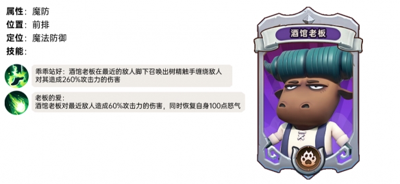 酒館老闆在最近的敵人腳下召喚出樹精觸手纏繞敵人對其造成260%攻擊力的傷害