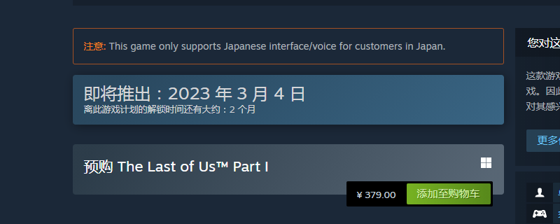 《最後的生還者》又名《美國末日》是頑皮狗在2013年開發的一款末日生存冒險劇情遊戲,而這款遊戲之前一直是PS平台獨佔的,最近索尼解除了它的獨佔,將會在2023年的3月3日上線Steam平台,而遊戲的售賣價格就是379元人民幣。
