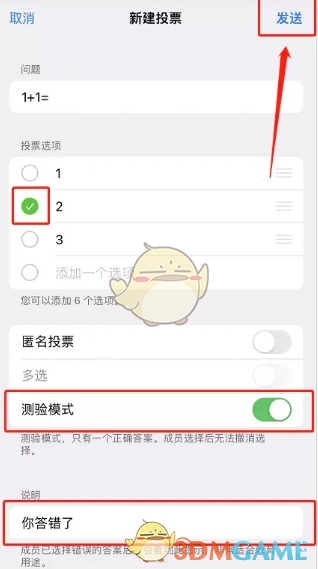 7、點擊開啟「測試模式」然後點擊「正確選項」設置正確答案,可以設置投錯的說明,最後點擊「發送」