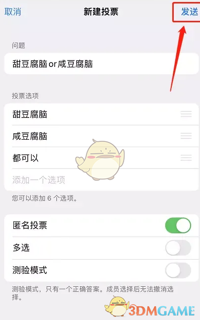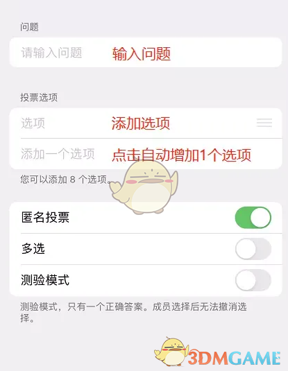 3、我們需要輸入問題、添加選項,選擇是否匿名投票、多選,也可以開啟測試模式。