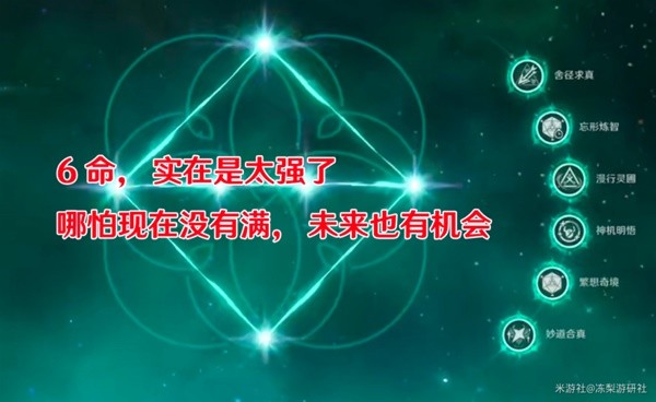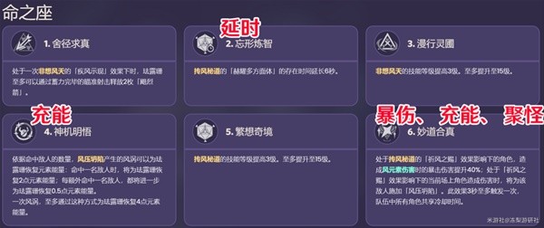 2命延長大招6秒持續時間,算上效果持續時間,充能足夠情況下近乎永續,這對魈這種長軸C尤為重要,保證覆蓋率;4命則是經典的充能命座,每次風渦至多恢復4點能量;6命則是開大效果下風系暴傷+40,且每3秒自動產生風渦聚怪。