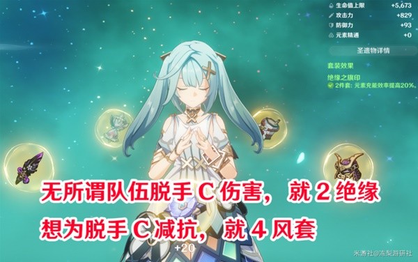 聖遺物就沒太多講究了,優先保證角色充能:一般是2絕緣+其他散件。若是隊伍配合夜蘭菲謝爾之類的「水火冰雷」高傷脫手副C,可考慮為琺露珊准備4風套減抗用。
