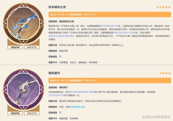 武器方面推薦「終末嗟嘆之詩」或「西風獵弓」:終末弓55.1%充能,還能給風C增加攻擊力;