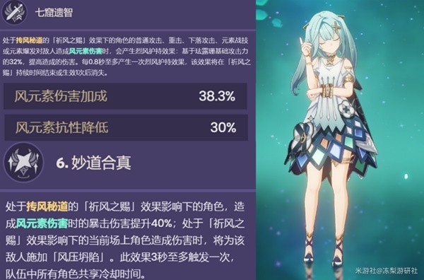 最高練度的情況下:13級大招38.3%風傷+降低30%風抗;天賦提供0.8秒一次的32%琺露珊基礎攻擊傷害轉化;6命40%風系暴傷+3秒一次的自動聚怪。
