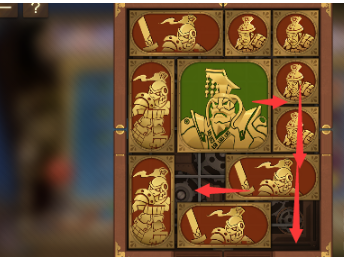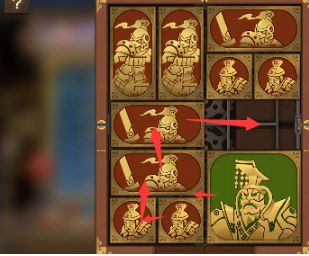 2、然後左上方的長方形向右移動,左下角的長方形向上移動,下方的兩個長方形全部向左移動,右下角的正方形橫著排列,將軍向下。