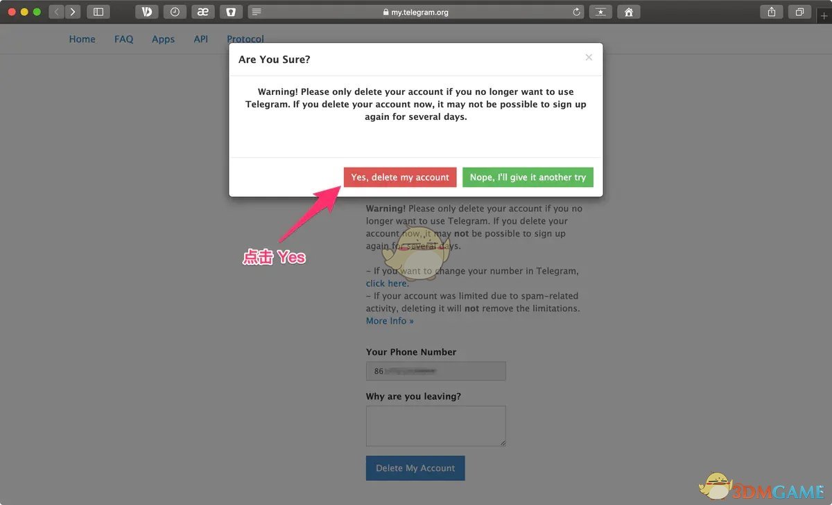 在「Your Telegram Core」頁面點擊「Delete account」,最後在Delete Your Account頁面輸入我們電話號碼,仍然是國際格式。點擊最下方「Delete My Account」就可以啦,就完成了電報賬號的刪除。