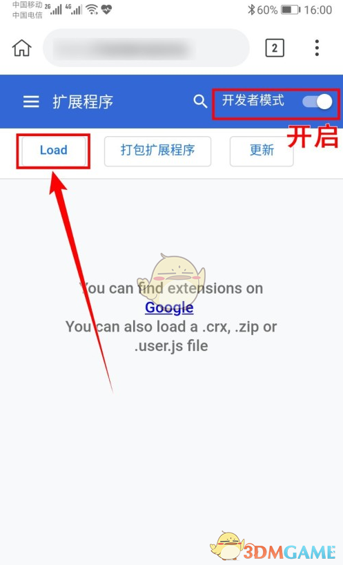 4、之後就會進入到擴展程序界面了,我們需要先將右側「開發者模式」開關打開,然後點擊下方的"load"選項。