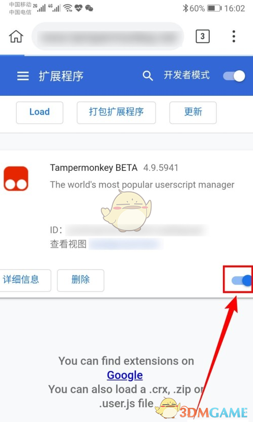 8、然後我們找到並點擊Tampermonkey 擴展插件文件。點擊之後即可讓其安裝了,我們將下方開關打開即可開始使用了。