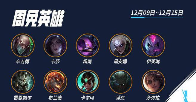 本次限免的時間為12月09日-12月15日,辛吉德、卡莎、凱南、黛安娜、伊芙琳、雷恩加爾、布蘭德、卡爾瑪、派克、莎彌拉等英雄加入周免。