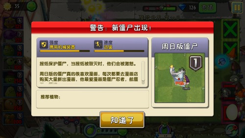 關卡中有新殭屍出現,是周日版殭屍。報紙保護殭屍,當報紙毀滅時,他們會被激怒。報紙殭屍的增強版,報紙比較厚,玩家們可要當心了。