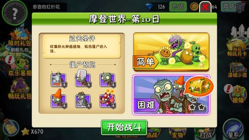 摩登世界第10日過關條件:收集陽光種植植物,抵擋殭屍的入侵