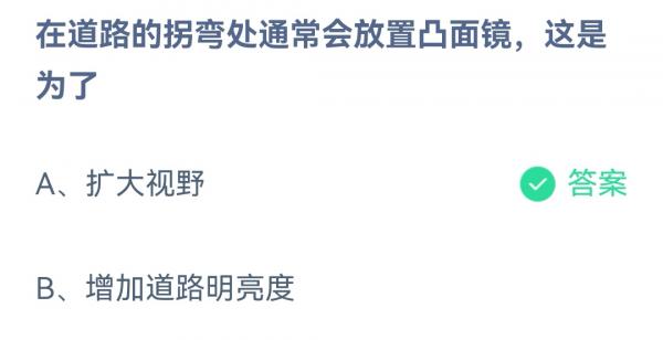 2022支付寶螞蟻莊園12月12日的題目已經更新了,今天的題目為:在道路的拐彎處通常會放置凸面鏡這是為了?正確答案是什麼,擴大視野還是增加道路明亮度呢?可能很多小夥伴可能還不太清楚。下面小編就為大家帶來了正確答案分享,希望能幫助到你。