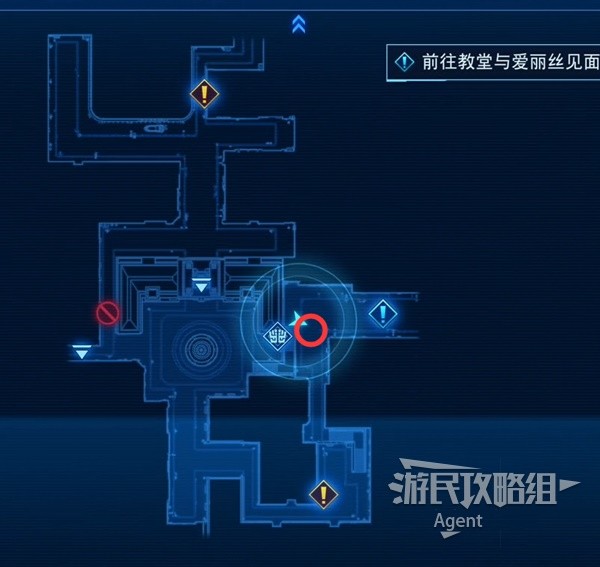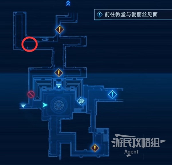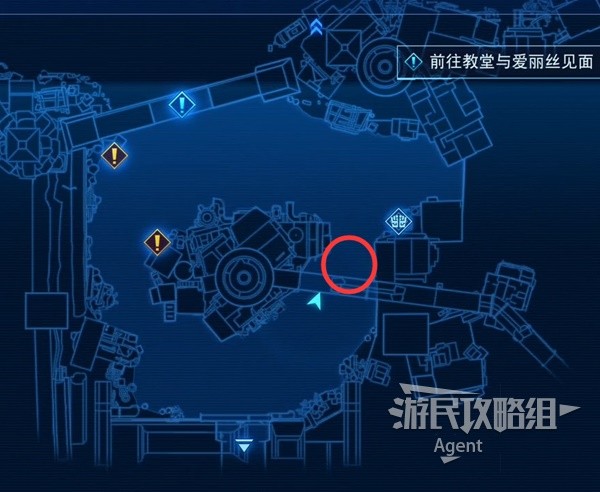 第5章一開始,出門來到噴泉廣場,中間那個黃色感嘆號就是抓間諜的任務,第一個間諜就在下圖圓圈處。