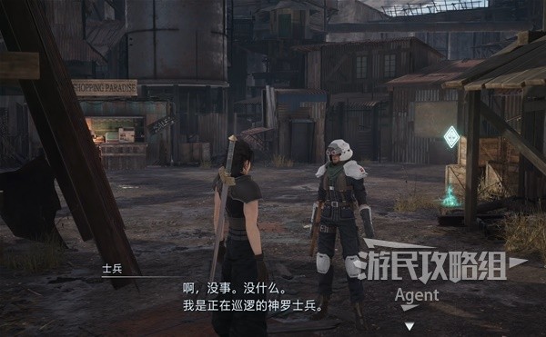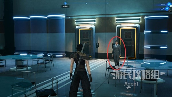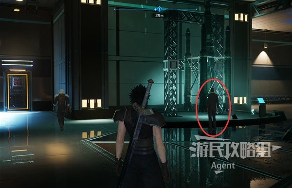 回到神羅大廈,第三個間諜在入口大廳的電梯口,需等他從電梯里出來。等不到的話就坐電梯刷新刷新。