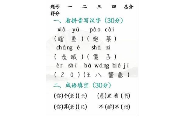 抖音熱火文字遊戲《漢字找茬王》關卡期中考試完成判卷怎麼過關?這一關需要批改試卷,判斷答案的正誤。下面是小編給大家帶來的抖音小遊戲《漢字找茬王》期中考試完成判卷通關攻略,不清楚如何過關的小夥伴們一起來看看吧。