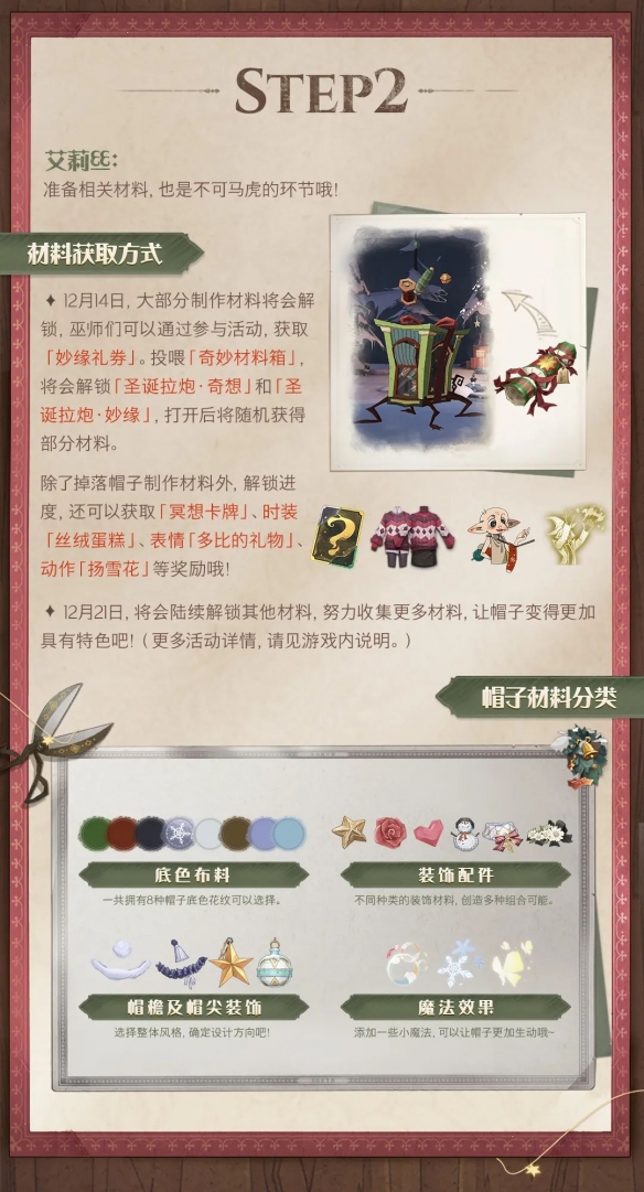 Step2-攢攢材料:參與日常活動將獲得「妙緣禮券」,投喂「奇妙材料箱」開啟「聖誕拉炮」,可隨機獲得豐富的制帽材料。
