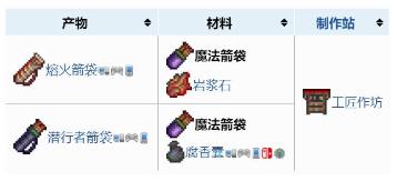 熔火箭袋製作:使用1個魔法箭袋和1個岩漿石,可以在工匠作坊合成1個熔火箭袋。