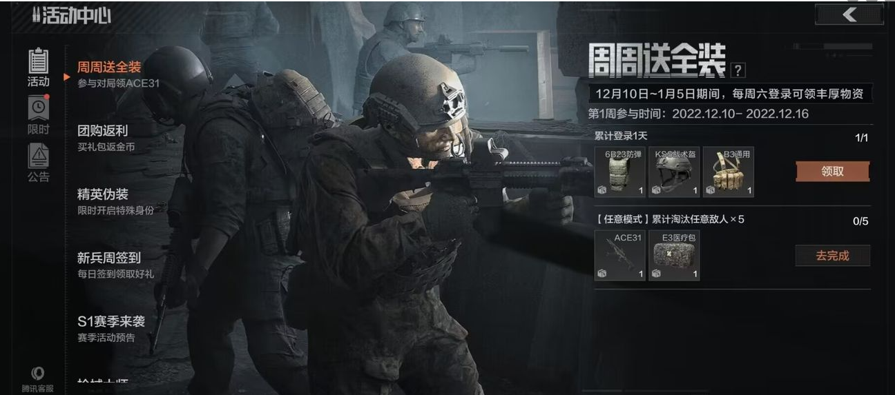 你還在害怕起全套破產嗎?你還在擔心自己的武器護甲不夠自己造的嗎?你還在因為不捨得起全套進暗區從未勇闖封鎖區嗎?周周送全裝福利大放送活動來了!只要每周六登錄及完成對局任務即可領取4級裝備及高級槍械。本周獎勵為ACE31突擊步槍、6B23防彈、KSS戰術頭盔、B3通用彈掛,後續獎勵更豐厚,每周六與你不見不散!先鋒們不要忘記登錄,領取每周屬於你的全裝包!>>>> 精英偽裝者