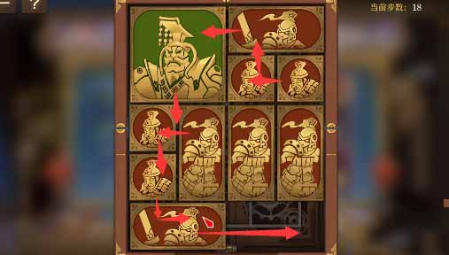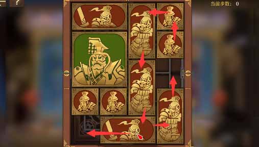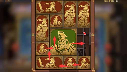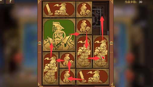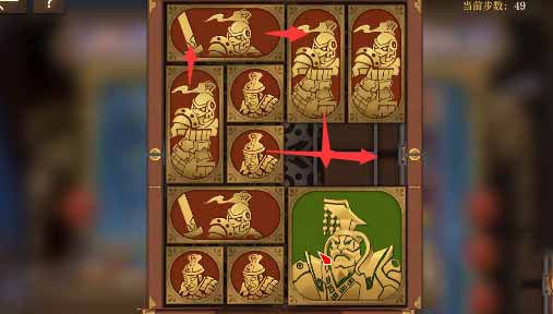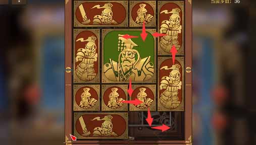 5、左下的小方塊全部到右下角,將軍向下移動一格,上方的小方塊向下一格之後向左一格,右上的豎直方塊向左,右下的豎直方塊向上。
