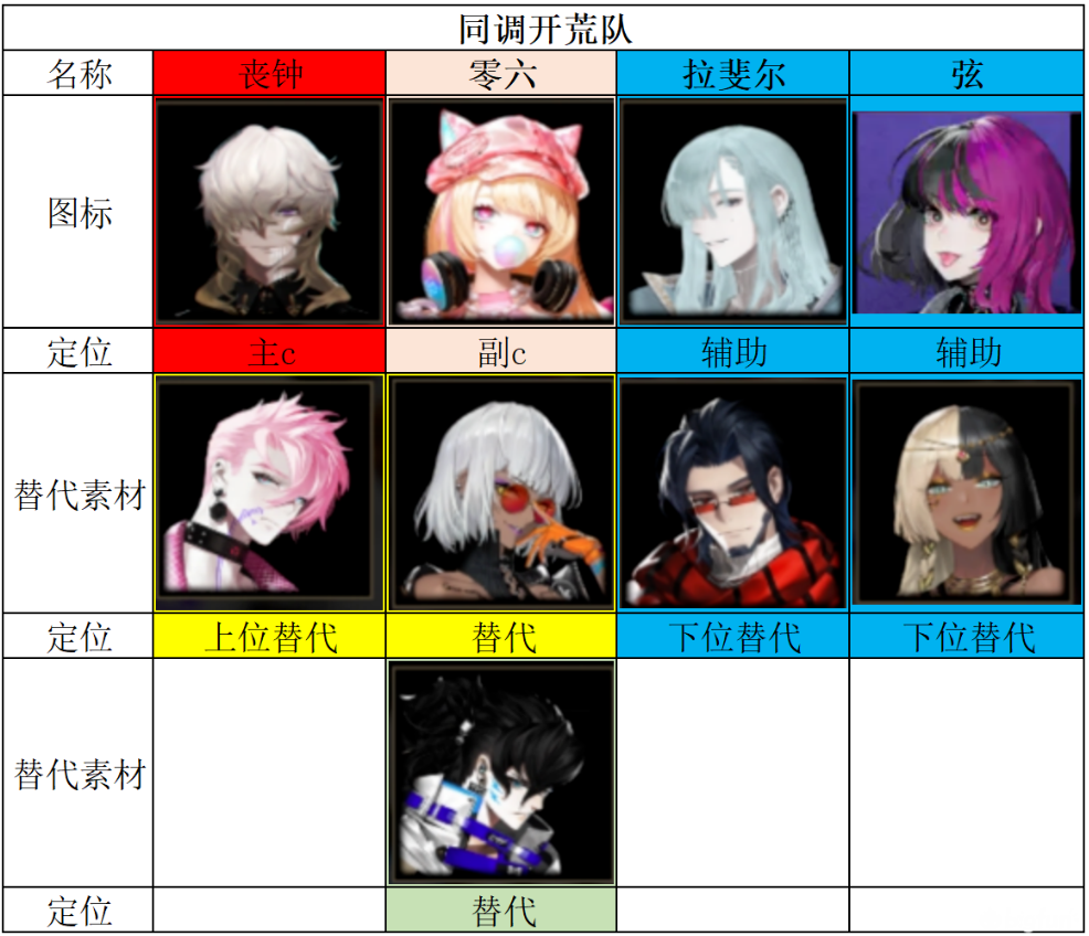喪鍾+零六(可換建御丸)+拉斐爾(可換叛逆)+弦(可換奇斐)。