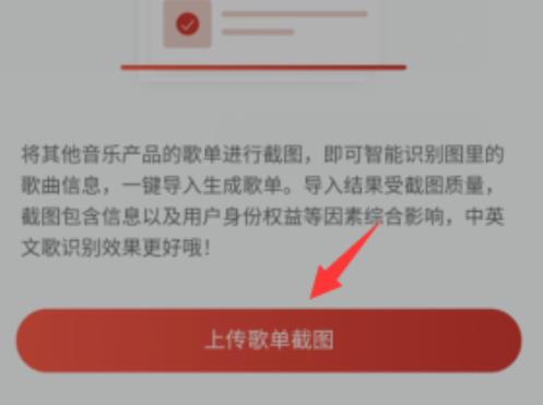 5、然後進入「截圖導入歌單」這個界面,在界面中我們上傳剛才保存的歌曲列表截圖就可以識別歌曲導入了。