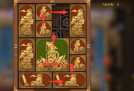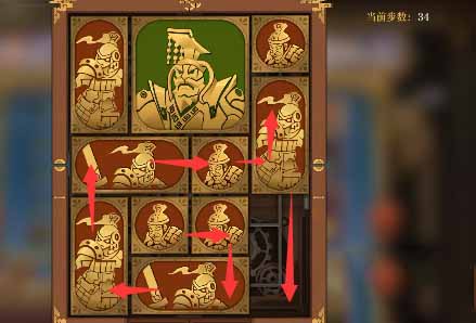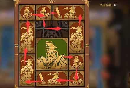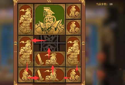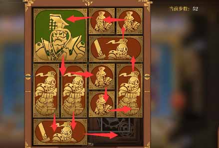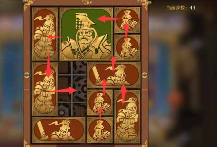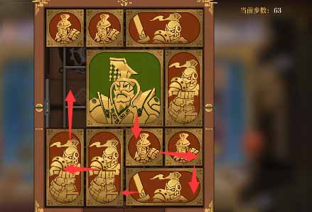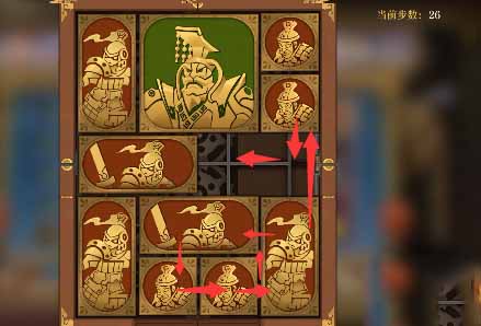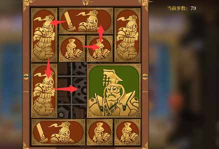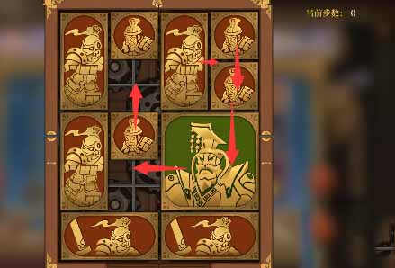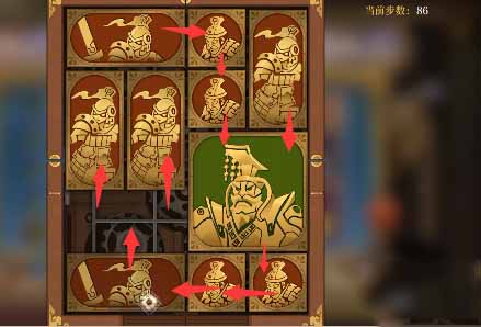 1、左側中間小方塊向上一格,將軍向左一格,右上的小方塊全部向下移動,右上的豎著方塊向右一格。