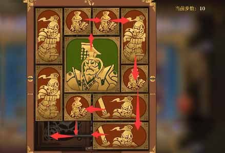 10、然後上方小方塊填到中間的空格處,右上的水平方塊向中間一格,左右的豎直方塊全部向上一格,下方的水平方塊再向左一格,右下的小方塊水平放置在右下角,將軍向右移動一格。
