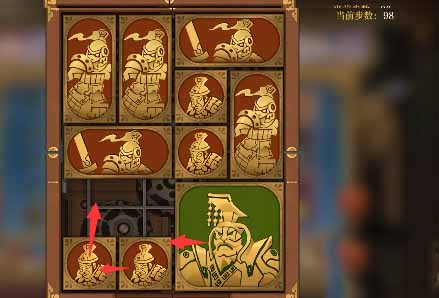 3、左下的小方塊移動到左下角,然後水平方塊全部左移一格,右側的全部下到底,上方中間的小方塊移動到右側,將軍再向上一格。