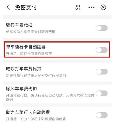 3、在免密支付中,將單車騎行卡自動續費右側的按鈕關閉就可以了。