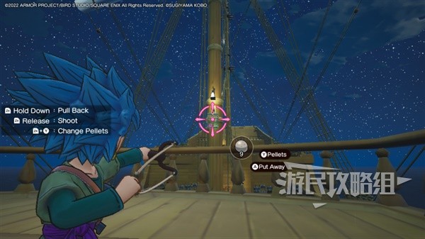 4.用彈弓打掉桅桿上的籠子(按下ZR拉弓,然後通過右搖桿瞄準,松開ZR發射石子彈)。