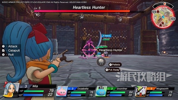 23.開門後遭遇BOSS惡魔武器。這場戰斗難度不高,站在遠處用彈弓打它就行,其他隊友會靠上去圍攻它;如果想從近距離打它,那麼可以先繞到它背後,尋找時機攻擊,不過要注意BOSS在揮動手中武器時記得跑開,這招會攻擊它四周的所有人。