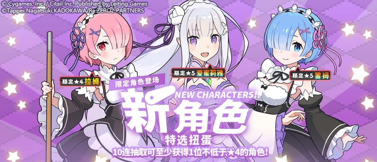 本次特選扭蛋中,開放限定★5角色【愛蜜莉雅】、【雷姆】、限定★4角色【拉姆】的抽取,且出現概率提升!