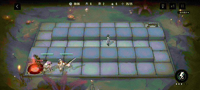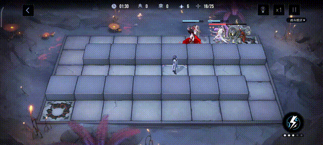 4、下路出蟲子後,等蟲子移動到海拉後一格時移動海拉,釋放海拉的大招,清理掉蟲子。然後將海拉移動到能阻擋住小丑的位置,等小丑瞬移到上路。小丑移動到上路後,調整下站位,讓海拉阻擋機器人,九十九放到海拉後面。