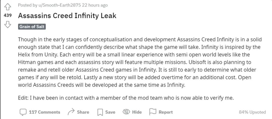Smooth-Earth2875自稱在育碧工作過,同時向Reddit的管理團隊提交了證據。但由於是新用戶,Reddit管理團隊已經阻止了他。有鑒於此,以上爆料可信度並不高。如果Reddit管理團隊認證了這一消息,那麼這個帖子會繼續更新。