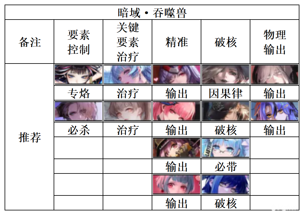 吞噬獸是頂替原「灰發少女」的位置,特色屬性是生命S,理論上隊伍通用,較為推薦隊伍是「物理隊」,推薦角色如上。