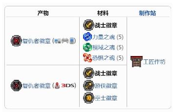 使用1個戰士徽章,1個力量之魂,1個視域之魂和1個恐懼之魂,可以在工匠作坊合成1個復仇者徽章。