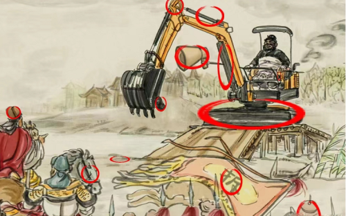 圖中左邊的人頭上是蕎麥饅頭,右下角的人頭上是肥腸,中間有一個很大的拆字
