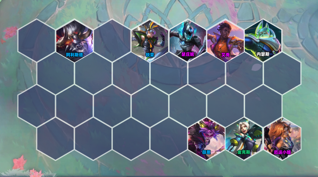 1.陣容組成:【狗頭、金克絲、牛頭、銳雯、薇恩、艾克、女槍、豬妹】;